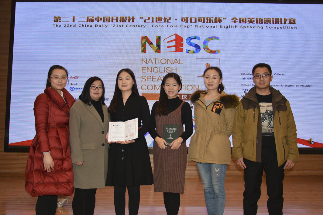 12月18日,第22届中国日报社“21世纪•可口可乐杯”全国英语演讲比赛河南赛区决赛在郑州航空工业管理学院新校区举行,学院人文分院2014级英语专业尹诗贝、2015级英语专业的刘楚乔分别获得一等奖、三等奖的好成绩,宋格、李盈盈两位老师荣获优秀指导教师奖。