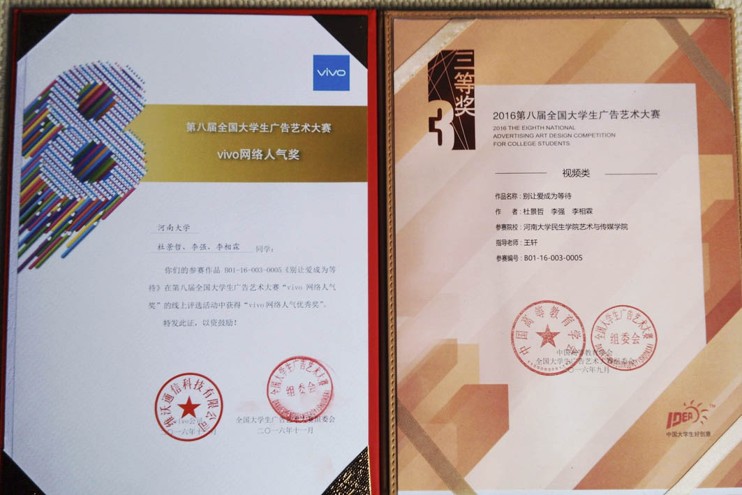 11月27日,第八届全国大学生广告艺术大赛颁奖典礼在北京举行。由学院2014级广告学专业杜景哲、李强和李相霖三位同学创作的广告创意作品《别让爱成为等待》获得 “视频类三等奖”及“vivo网络人气优秀奖”两项大奖。