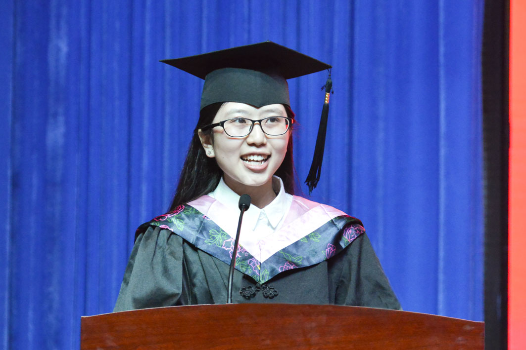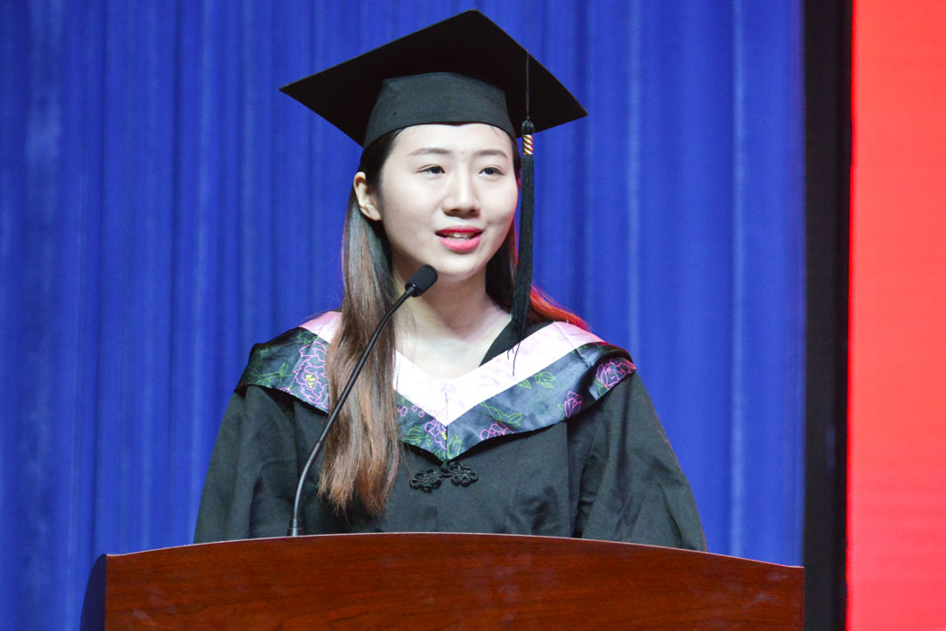 优秀毕业生代表2013级会计学专业栾亦可、广告学专业许静先后发言,怀念大学四年时光,感谢母校的点点滴滴,并表示自己将满怀憧憬,在新的未来展翅翱翔。在校生代表2014级法学专业汪思琪、食品质量与安全专业夏子涵先后发言,毕业生辅导员代表朱利娟、胡会丽先后发言,期望学子们做一个懂得感恩、坚守诚信,能够担起责任的人,并代表学院老师向毕业生传达了美好的祝愿。