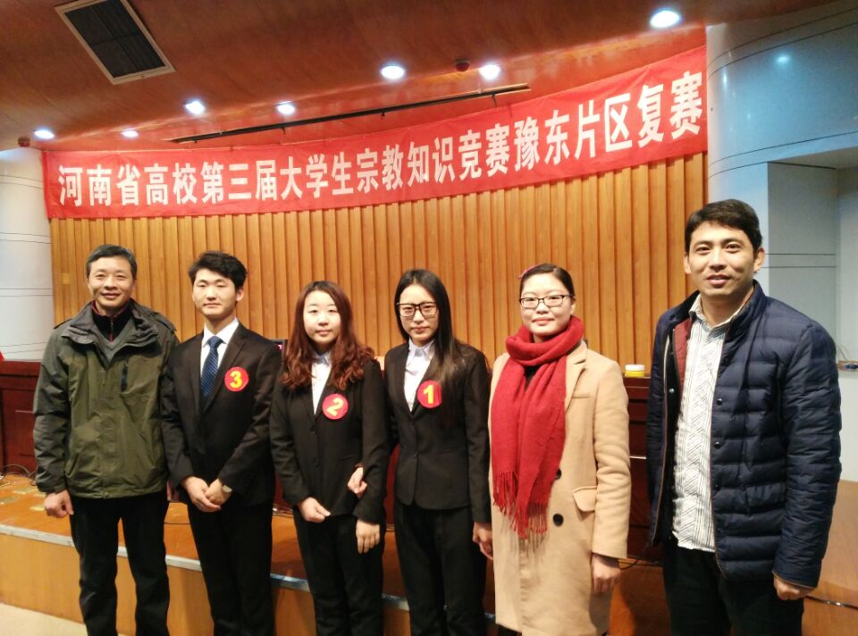 12月9日,河南高校第三届大学生宗教知识竞赛豫东片区复赛在河南大学行政楼报告厅举行。河南大学民生学院理工分院学生尹虹博、李梦情、牛翔代表我院参赛。学院党委副书记王建国,理工分院党总支副书记王新收亲临现场为我院参赛选手加油鼓劲。