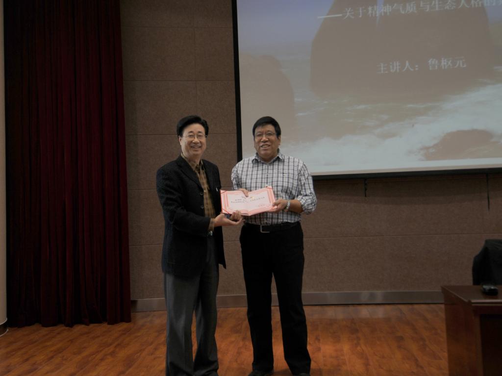 学院院长李文山为鲁枢元教授颁发了河南大学民生学院客座教授聘书,副院长王天仕主持讲座。