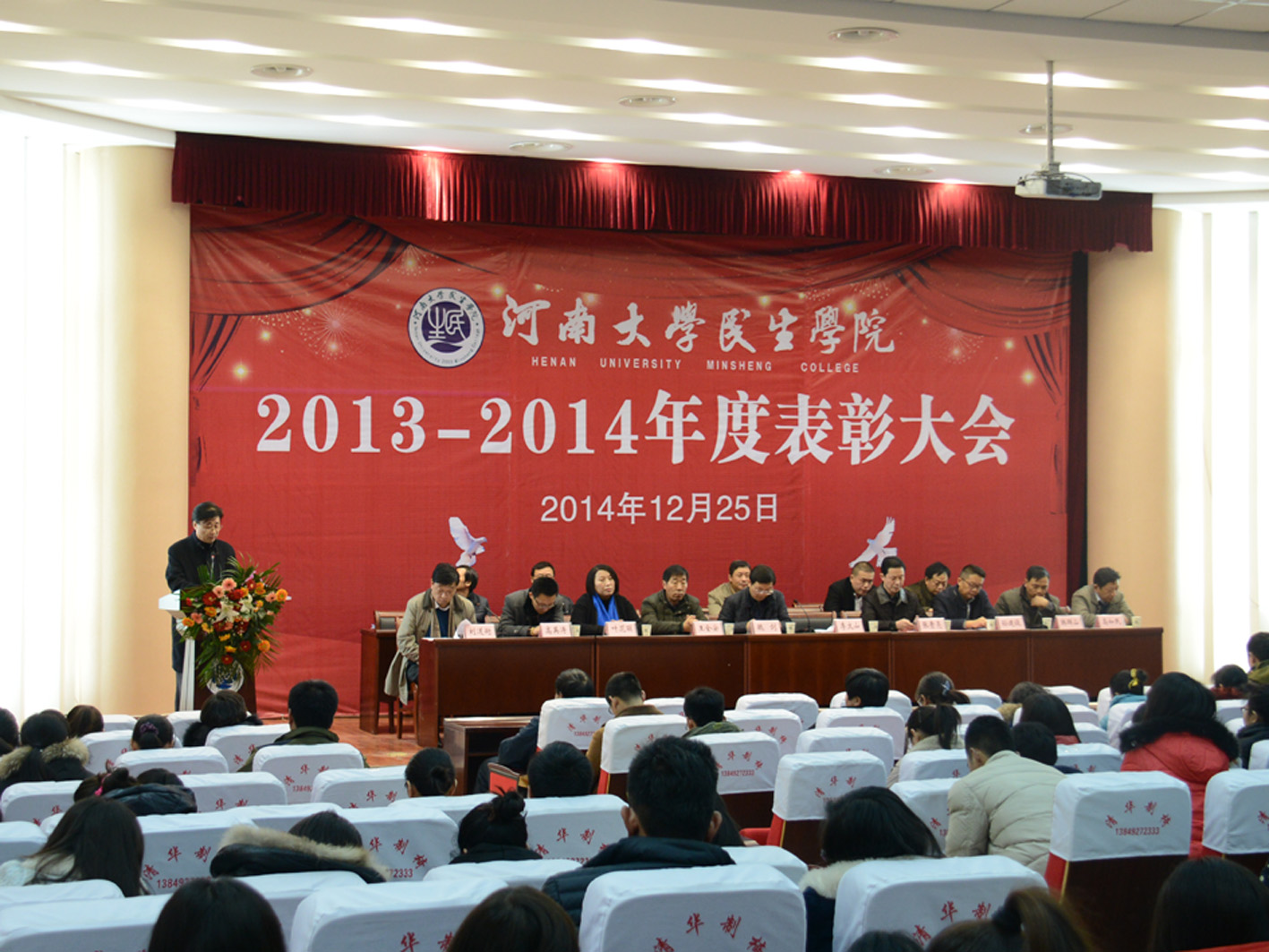 2014年12月25日下午,河南大学民生学院2013-2014学年度表彰大会在学院艺术楼报告厅隆重举行。学院院长李文山,院党委书记魏剑,党委常务副书记、纪委书记刘道衔,常务副院长高如民,党委副书记、工会主席王建国,副院长冯长银、张国梁、王天仕,各部门、各分院负责同志,师生代表参加大会。刘道衔主持会议。