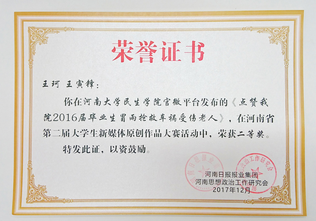 在此次评比中,学院在全省45所高校申报的134个校园新媒体平台和626件校园正能量作品中脱颖而出,学院官方微信公众号“河南大学民生学院”荣获“最具新闻表现力奖”,网络图文《点赞!我院2016届毕业生冒雨抢救车祸受伤老人》获得新媒体原创作品二等奖。