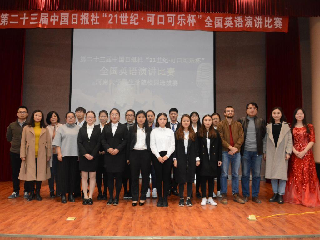 11月2日下午,第23届中国日报社“21世纪·可口可乐杯”全国英语演讲比赛河南大学民生学院选拔赛总决赛在学院艺术楼报告厅拉开帷幕。河南大学外语学院付江涛老师、外教NEELTJE ,河南大学民生学院教师张菊芳、邱光华、马浩、宋格、李盈盈担任此次比赛评委。活动由人文分院英语专业学生李菲、王松旺主持。