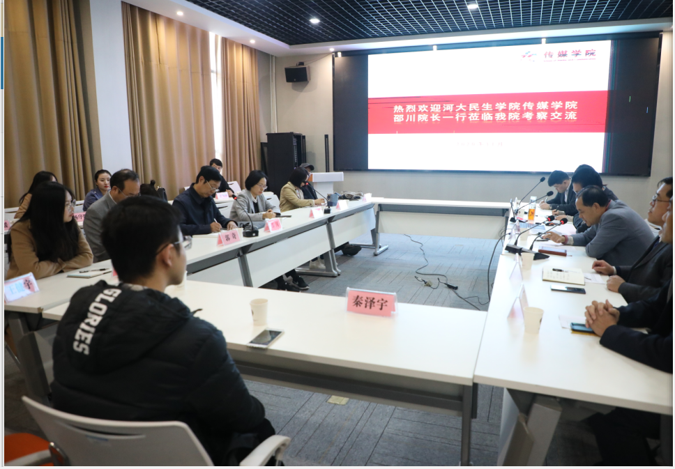 11月12日上午,河南大学民生学院传媒学院院长邵川、党总支副书记李丽、副院长高顺洁、专业建设学科带头人、团总支书记、教研室主任及部分骨干教师等14人到商丘师范学院传媒学院进行交流与考察。